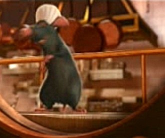 VIEW HIDDEN MICKEYThere is a Hidden Mickey in this scene of Ratatouille when Remy and Gusteau are looking into the kitchen.